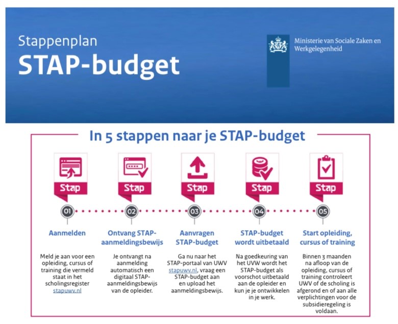 Werkenden en werkzoekenden kunnen vanaf 1 maart 2022 een STAP-budget van maximaal € 1.000 per jaar aanvragen voor scholing en ontwikkeling. U kunt deze subsidie gebruiken voor het volgen van een training, cursus of opleiding. De subsidie heet STAP, wat staat voor STimulering Arbeidsmarkt Positie.